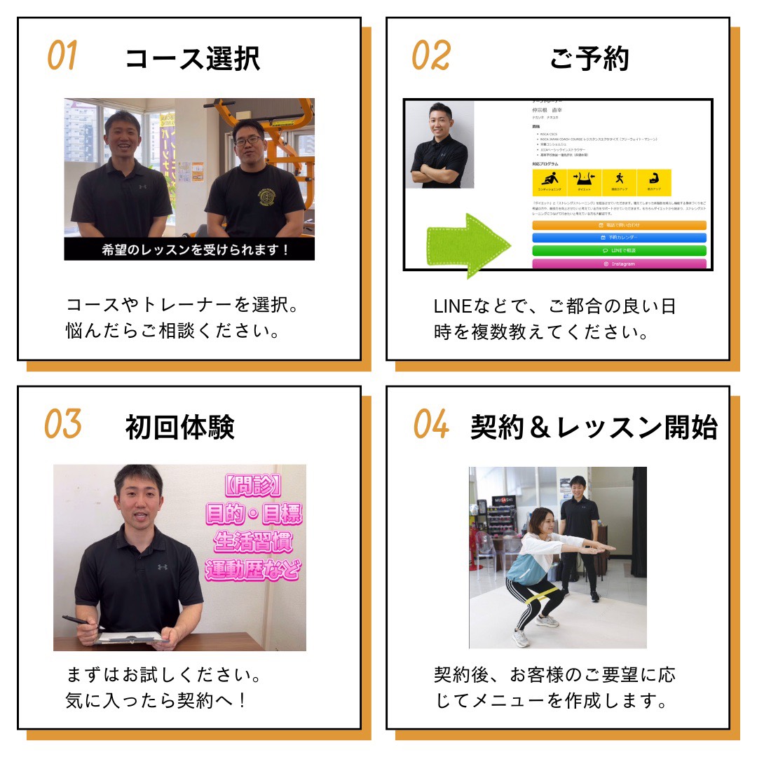ご希望のトレーナー、コース、日時がお決まりの方は、予約カレンダーまたはLINE、お電話にてお申し込みください。またトレーナー選びでお悩みの方は、お気軽にご相談ください。要望に合わせて、最適なトレーナーをご案内させていただきます。
